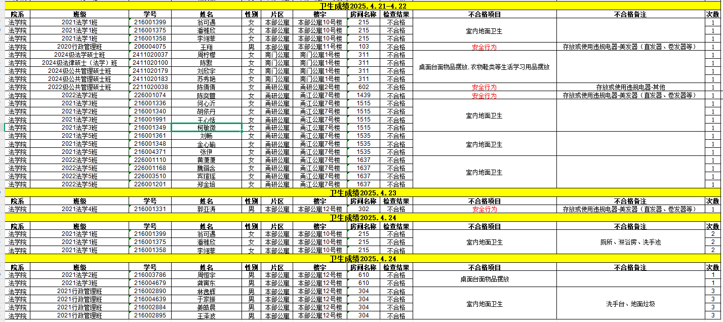 经校学生社区服务中心的检查,现对4月21日-4月25日卫生检查不合格的寝室予以公示,详见下表。