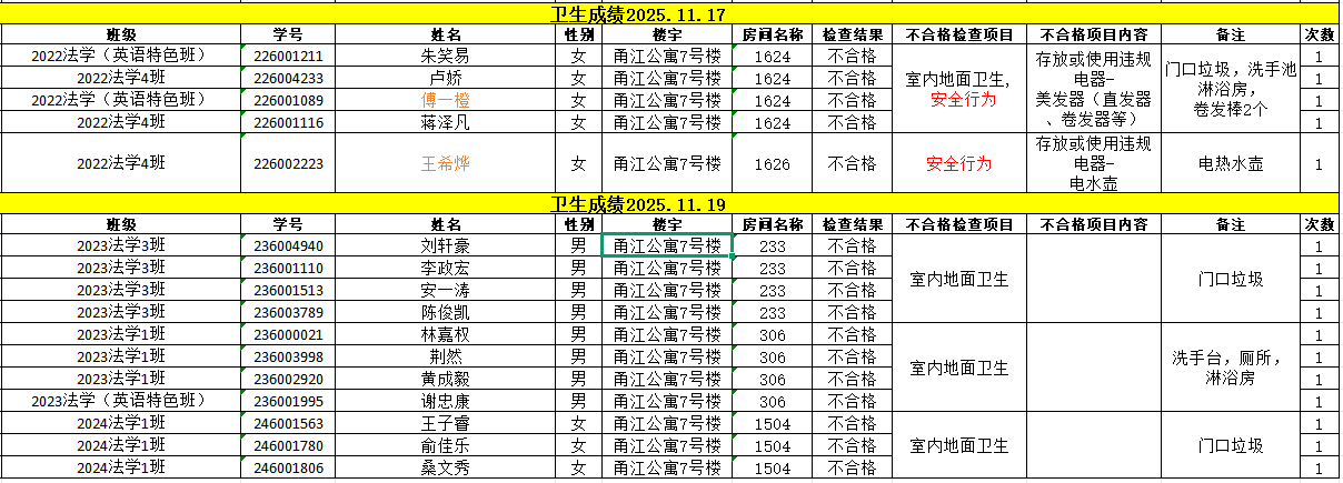 经校学生社区服务中心的检查,现对11月17日-11月21日卫生检查不合格的寝室予以公示,详见下表。