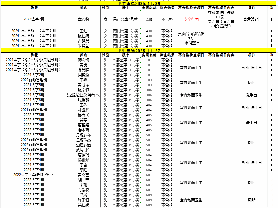 经校学生社区服务中心的检查,现对11月24日-11月28日卫生检查不合格的寝室予以公示,详见下表。