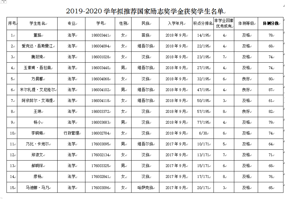 2019-2020学年日本无码 国家励志奖学金经学生本人申报、奖学金评选委员会资格审核、讨论,结合奖学金评定办法和学校下拨名额,最终拟推荐2019-2020年度国家励志奖学金名单公示如下: