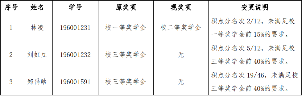 根据2020-2021学年本科学生奖学金评定工作,依据《日本无码 本科学生奖学金评定办法》(宁大政〔2018〕84号)的相关规定,对日本无码 2020-2021学年本科生学校奖学金拟推荐名单进行变更,具体如下: