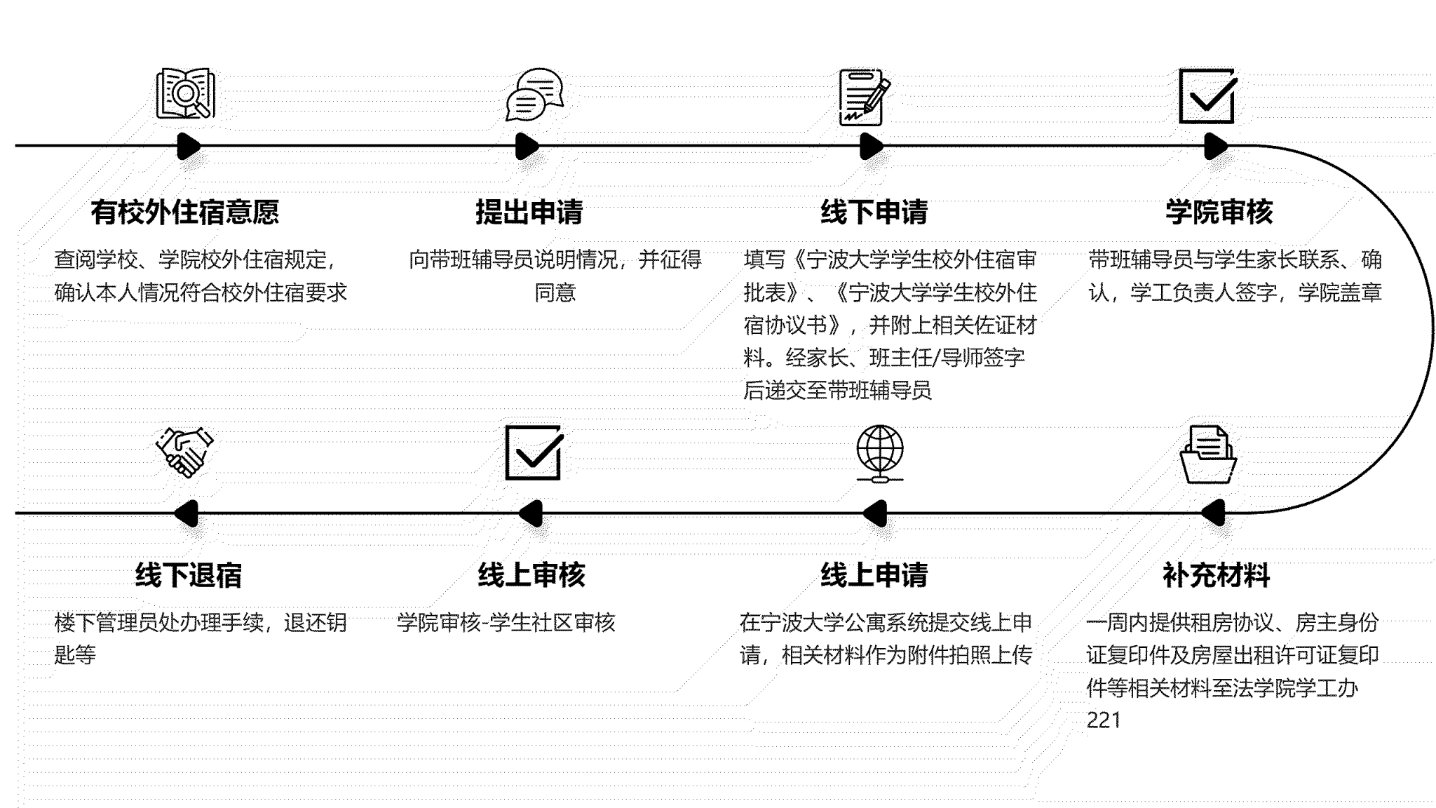 (五)学生校外住宿地点发生变更应及时向学院登记备案;每次申请的有效期为一学年。