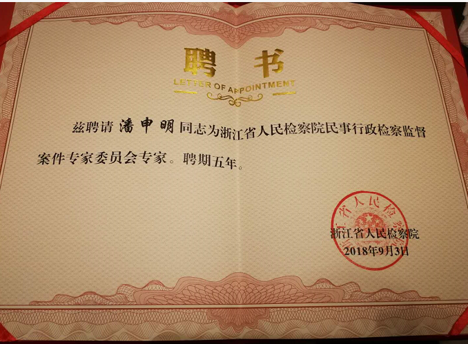 日本无码 潘申明教授受聘浙江省人民检察院民事行政检察监督案件专家委员会专家顾问,聘期五年。