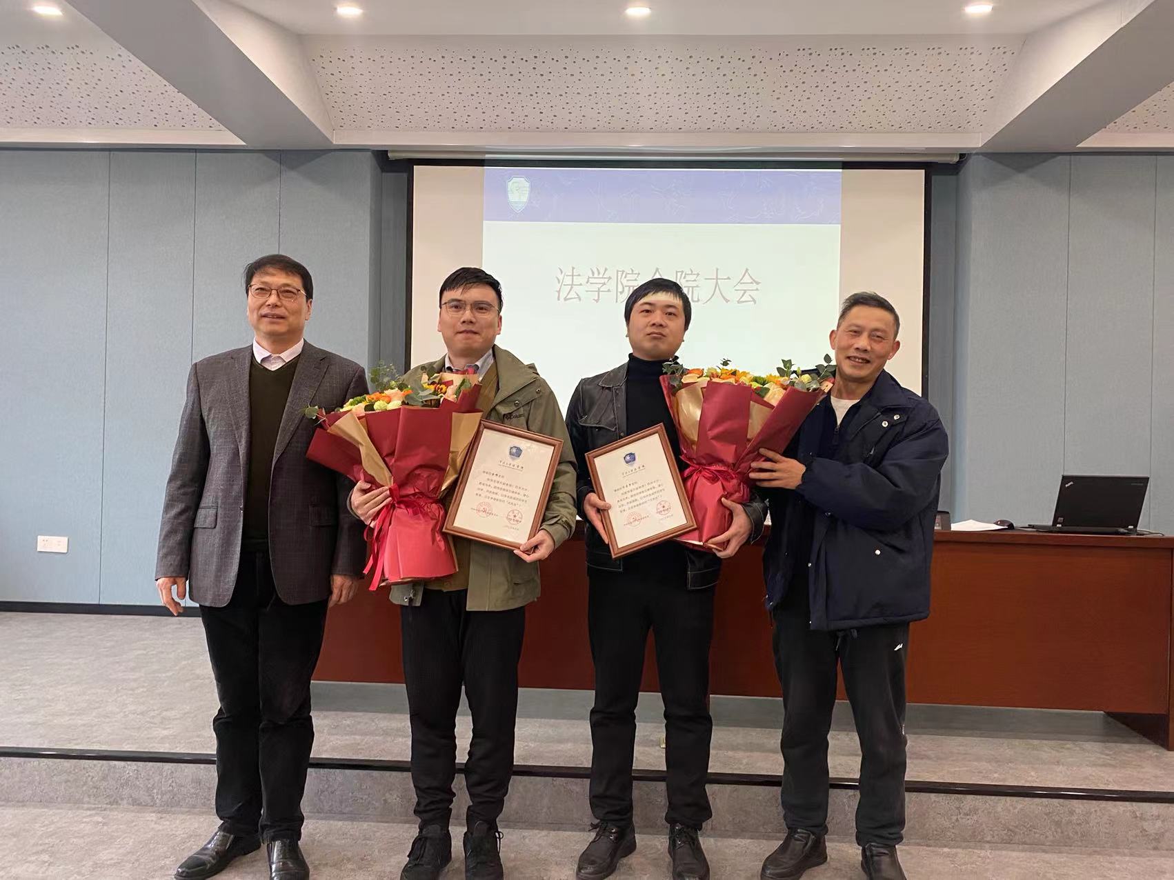 学院党委书记孙芬娜宣读了学校关于专业技术职务评聘结果。学院梁开银院长、民商法研究所所长刘满达教授为新晋高级职称的金耀、乔宜梦两位老师授予证书和鲜花,对新晋高级职称教师表示祝贺。