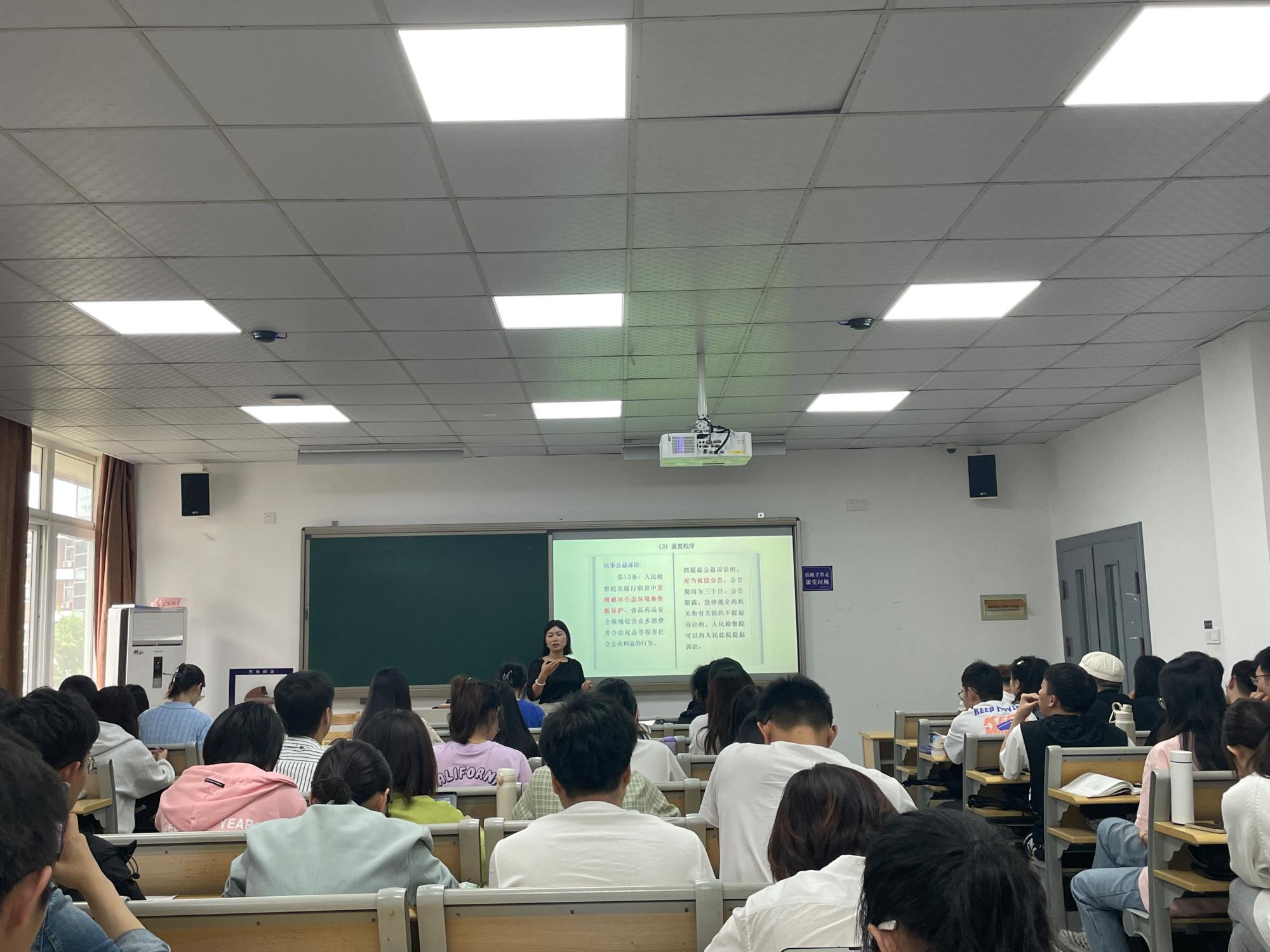 法律系郝会娟老师授课《环境资源法》,主讲内容是环境公益诉讼制度。课后在同一教室进行了公开课研讨活动,由学院法律系主任谢晓彬老师主持。研讨会上,各位老师就合理使用PPT辅助教学、突出授课重点、增强课堂互动、在讲课过程中增加课程思政内容等方面的问题开展了讨论,并提出了有益的建议。