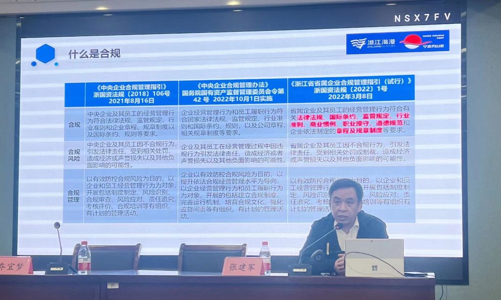 最后,张主任带领同学们领略了宁波舟山港集团合规管理的具体实践,宁波舟山港集团以“港通天下,服务世界”为集团全球宣传语,“规定经纬、合行宇寰”的海港合规文化标语也寓意着其合规管理的决心,展现了集团人人合规、事事合规、持续合规的价值追求。面对同学们提出的“宁波舟山港的企业法务需要具备哪些能力”的问题,张主任表示,专职管理人员应当具备包括专业能力、思维能力、表达能力、企业管理能力等在内的15个基本能力,对于尚在学习研究阶段的研究生,张主任鼓励同学们在学好专业基础课程的同时,将法律知识运用到具体实践中,多多参与法律活动以提升自我综合素养能力。