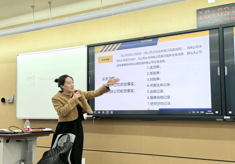 本次专题“商法原则的实务适用”,是围绕《商法总论》第三章商法的价值、理念和适用为知识点展开的实务授课,内容主要涉及经营自由、平等交换等商法基本原则在实务中具体表现。胡律师以主办的案例为蓝本,生动丰富地阐述了法律理念和原则在法律实务中的无形适用,同时为同学们带来了具有挑战性的实务演练题。