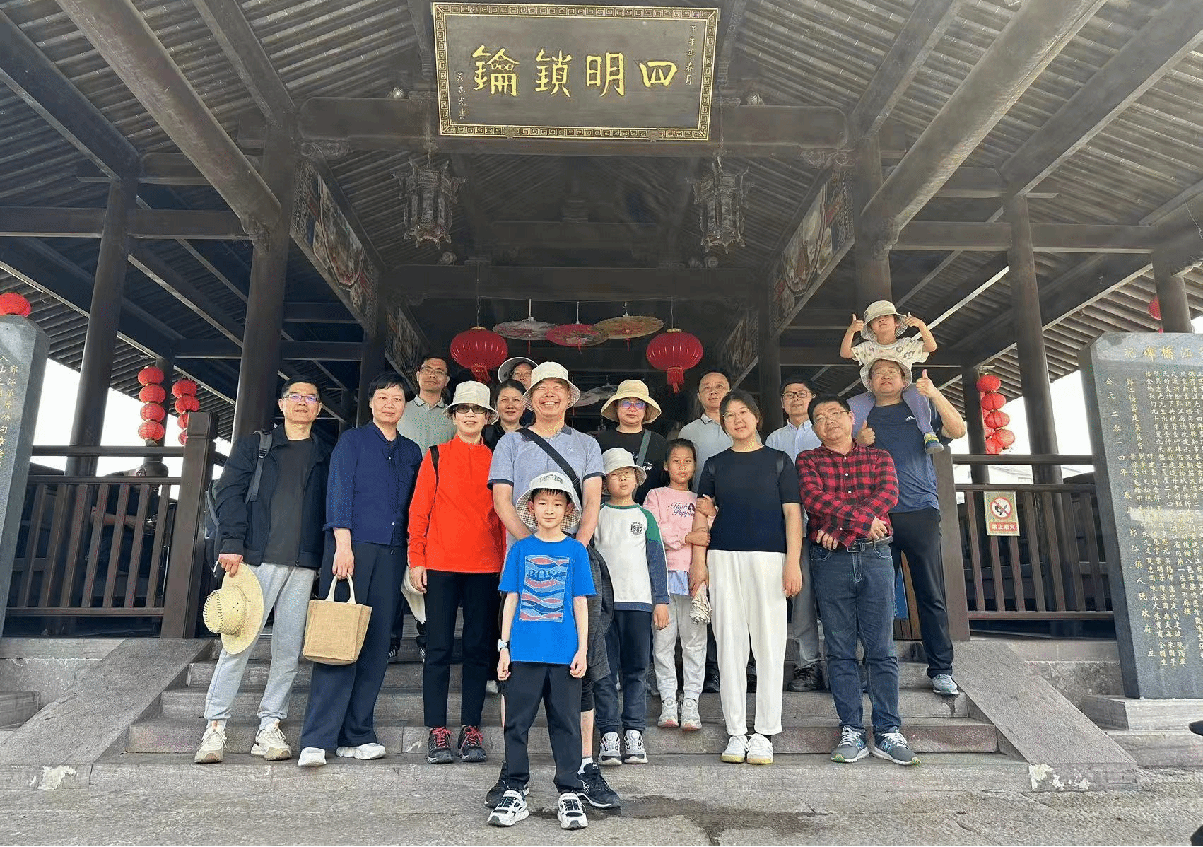 随后,大家参观了位于鄞江古镇的它山堰和廊桥。老师们信步在它山堰,惊叹于其悠长的历史渊源—与郑国渠、灵渠、都江堰同为中国古代四大水利工程,佩服甬城先辈的智慧;穿越鄞江廊桥,感受村民慢节奏生活,品鉴古镇的历史特色。