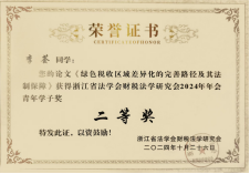 此次大会对青年学子论文进行了评审和颁奖。2022级本科生李荟《绿色税收区域差异化的完善路径及其法制保障》获二等奖,2022级本科生杨筱伟《新形势下纳税人权利保障的法治状况与优化路径研究》获三等奖,2022级本科生黄潇丹《住房市场分化下专项附加扣除政策的优化路径》和2024级本科生靳灿、冯婷玉《我国纳税人权利保障问题研究》获优秀奖。