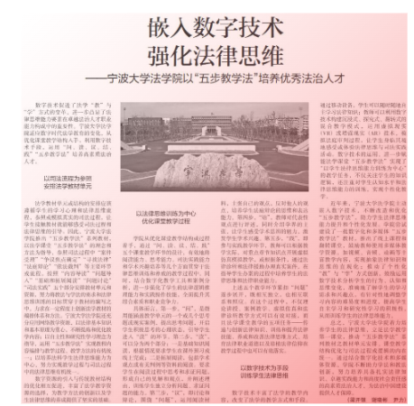 在法学教育领域积极探索与创新,以“五步教学法”为核心,结合数字技术,致力于培养具备扎实法律知识、卓越实践能力和高度社会责任感的高素质法治人才,取得了显著成效,成功探索出一条法学教育创新之路,近日中国教育报在显著位置刊发了该项人才培养创新举措。
