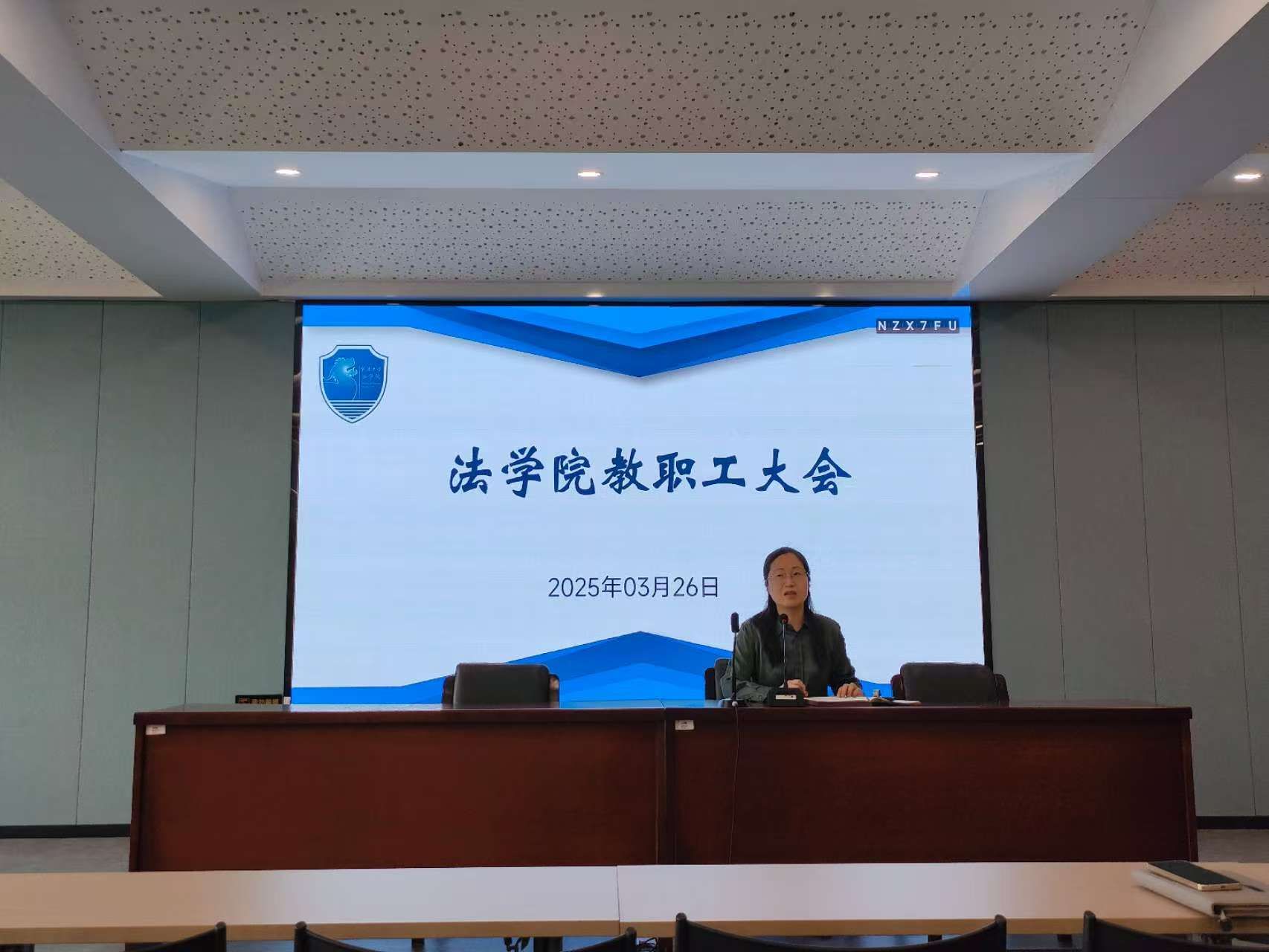 在学院217报告厅召开全体教职工大会。会议由学院党委书记孙芬娜主持,学院班子成员、全体教职工参会。