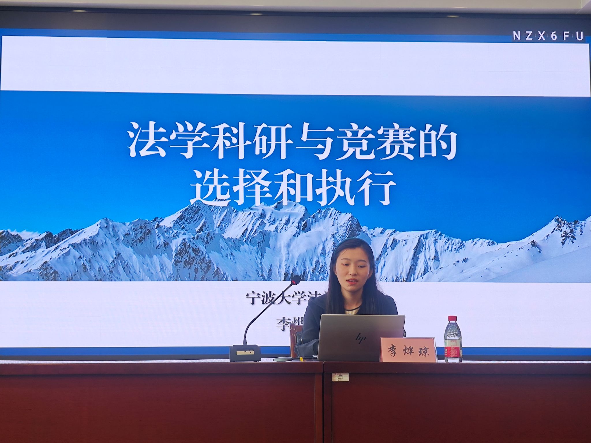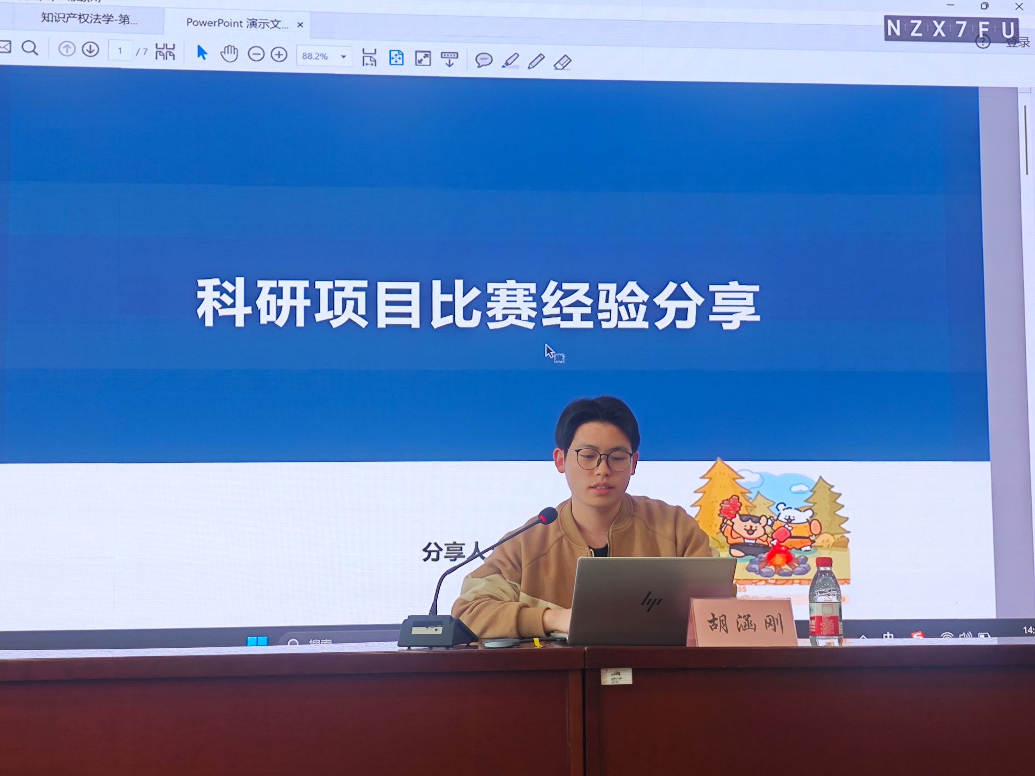 2022级法学专业本科生李烨琼从法学生科研竞赛的基本情况、科研竞赛的选择等方面进行梳理,为在场的同学提供了一份详细的重要赛事清单,并分析了科研项目和学科竞赛的种类、发展情况和优劣等,重点讲解了挑战杯、英文模拟法庭、中文模拟法庭等的准备工作。她强调计划的重要性,也鼓励在场的各位同学积极参与学科竞赛。她的分享深入浅出、清晰明了,为同学们带来许多思考。