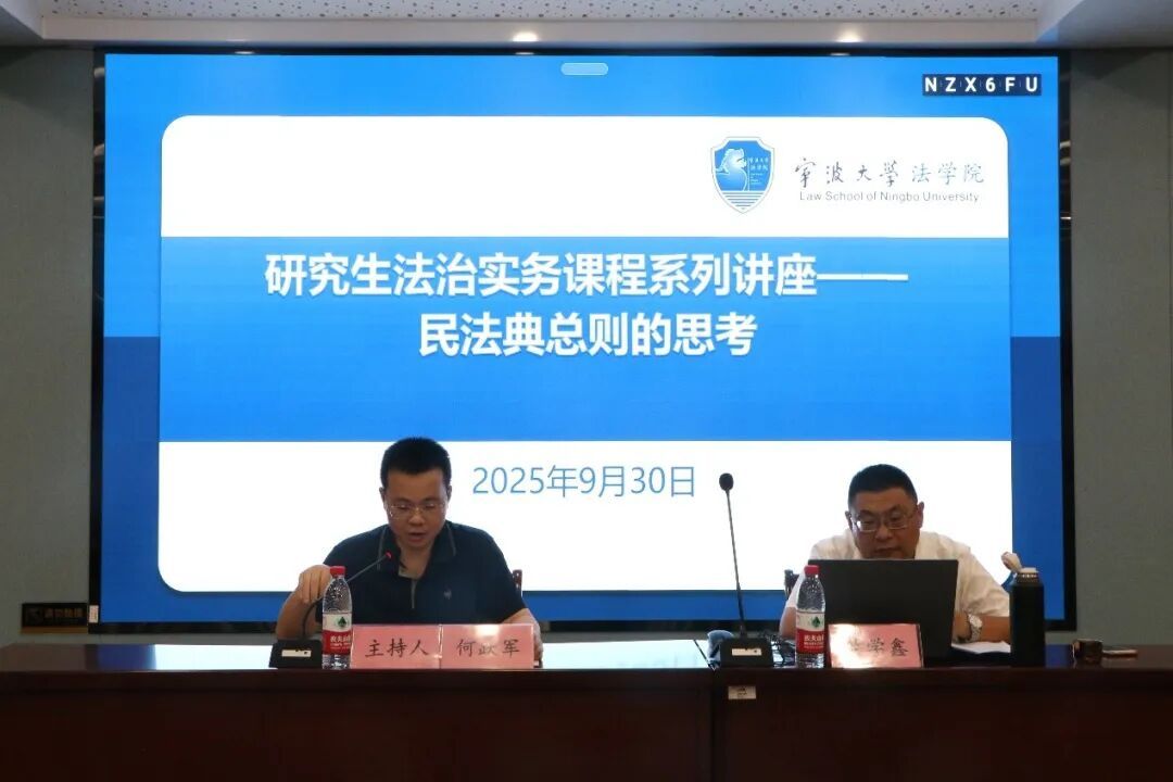 9月30日晚18:00,宁波大学法学院研究生法治实务课程系列讲座《民法典总则的思考》在法学院217室顺利举办。本期讲座由宁波市人民检察院民事检察部副主任、四级高级检察官兰学鑫主讲,法学院副院长何跃军教授主持。法学院2025级法律硕士全体同学聆听了本次讲座。
