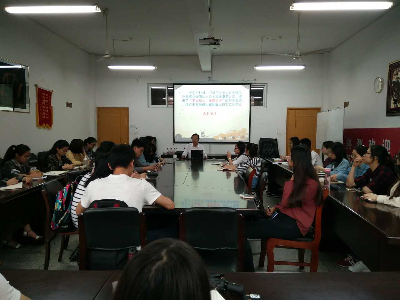 党委书记郑礼平老师为入党积极分子们上了一节生动的党课。郑书记这堂党课的主题是“中国共产党的指导思想”。