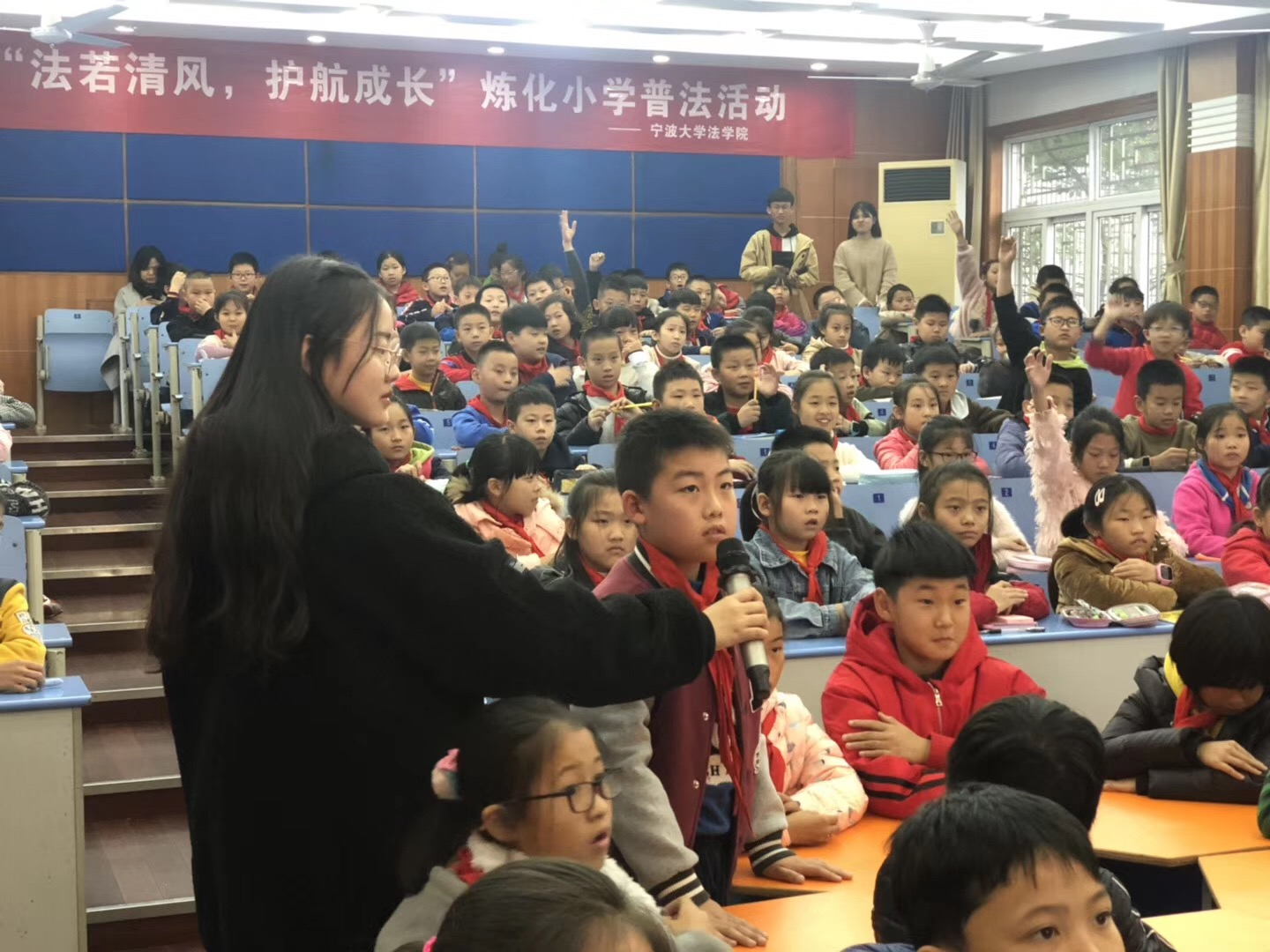 团委、青协和法律援助中心的多名普法志愿者走进镇海区炼化小学开展了“法若清风,护航成长”普法活动,180余名小学生参与此次普法活动。
