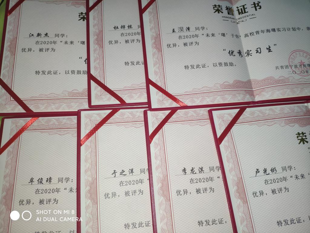 为期2个月的实习结束,2017级匡麒锦、张力、毛涛,2018级王淏泽、牟俊璋、李龙淇、于之洋、卢光彬、江新杰、杜烨栋共10位同学因工作突出获得了海曙区“优秀实习生”称号。