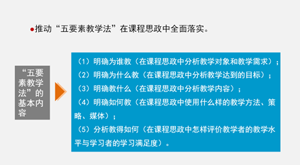 最后,郑教授提出法学类课程思政改革“难”还是“不难”之问,并分析了教师自身的难点、教学内容嵌入上的难点、教学推进的重点等内容。同时,他指出要推动“五要素教学法”在课程思政中全面落实,处理好课程内容与思政内容的关系,处理好线上线下课程全方位嵌入课程思政内容。