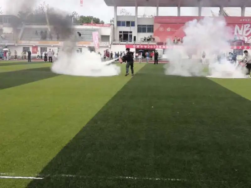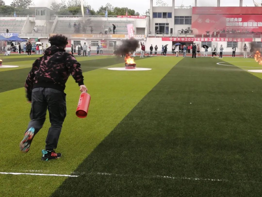 本次消防运动会在操场上开展,分为男子组和女子组,两组赛制略有不同。比赛开始前,参赛者们穿戴上学校提前准备好的防护服、头盔和手套。比赛时,男子组使用2kg干粉灭火器、女子组使用叠成方形的湿麻袋,在听到发令员鸣枪发出“开始”信号后,跑向放置在距离起点二十米处的燃烧着的油桶,扑灭其火焰后冲向终点线。