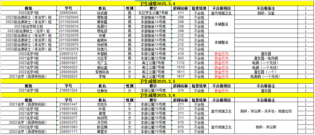 经校学生社区服务中心的检查,现对3月3日-3月7日卫生检查不合格的寝室予以公示,详见下表。