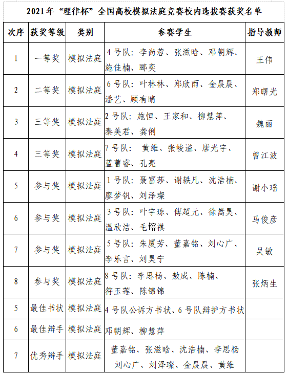 为培养具有创新精神和实践能力的卓越法律人才,促进我校法科大学生综合素质的全面提升,提高人才培养质量,活跃校园气氛、开拓思想,展现大学生朝气蓬勃、积极向上的精神风貌,促进法学学科教学改革,在整体上推动我校法学教育的发展。根据学校有关大学生学科竞赛的通知,按照学校要求组织进行了本次竞赛。现将模拟法庭竞赛获奖名单予以公示,具体名单详见附件。