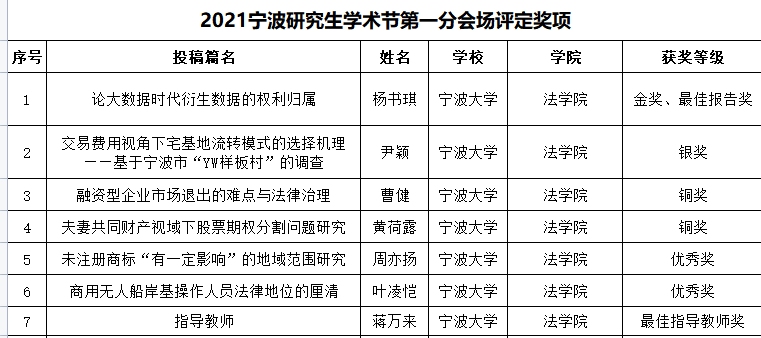 根据2021年宁波研究生学术节法学院分会场奖项设置、评定及奖励办法的通知,经现场评审,结合论文盲审成绩,现将第一分会场最终评定结果进行公示:
