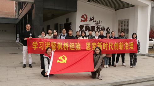 党的十九届五中全会指出,要坚持和发展新时代“枫桥经验”,这为我院公共管理和法学两专业人才培养和科学研究提出了新要求。2020年12月9日,公共管理研究所党支部、理论法学与刑法学研究所党支部和公共管理专业学生第四党支部,共同组织“学习诸暨枫桥经验,思索新时代创新治理”主题党日活动,共计18名师生参加了本次活动。上午,大家在导游带领下参观考察了枫源村党群服务中心、文化礼堂、文化长廊和村容村貌,了解村庄基本情况、治理体系、智能化服务设施和枫桥经验的生根与发展。