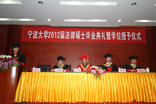 4月13日上午,我校举行2012届法律硕士(J.M)毕业典礼。校党委书记程刚,宁波市中级人民法院政治部主任李章军,校研究生院(筹)执行院长汪浩瀚、宁波大学法学院党委书记方晓春、院长张炳生、副院长刘满达以及相关任课教师代表出席了本次毕业典礼。