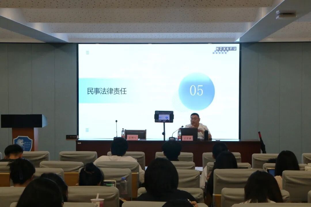 9月30日晚18:00,宁波大学法学院研究生法治实务课程系列讲座《民法典总则的思考》在法学院217室顺利举办。本期讲座由宁波市人民检察院民事检察部副主任、四级高级检察官兰学鑫主讲,法学院副院长何跃军教授主持。法学院2025级法律硕士全体同学聆听了本次讲座。