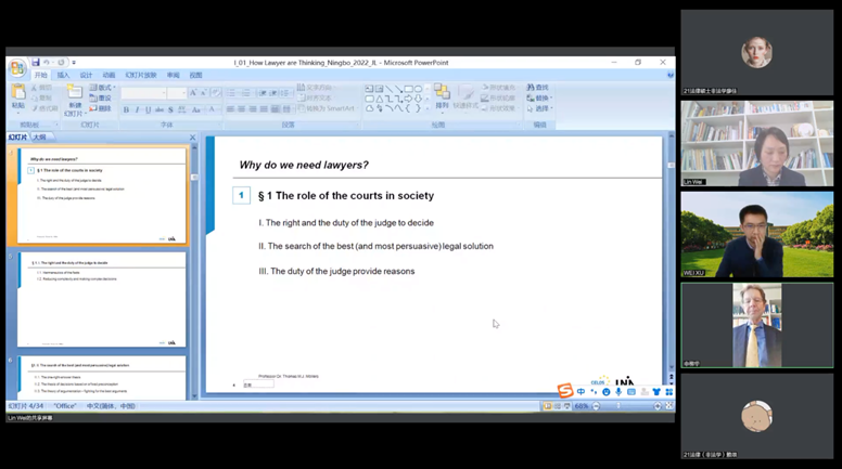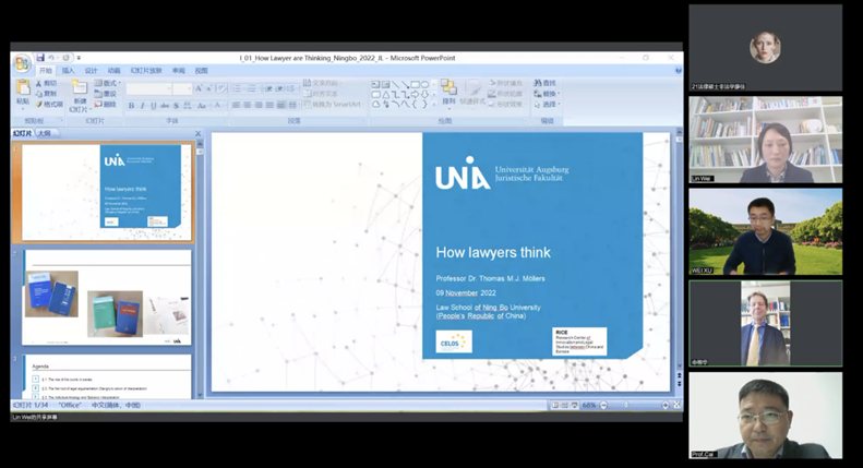 11月16日晚,人文社会科学名家讲坛第328讲暨浙东法学讲坛第七讲由德国奥格斯堡大学法学院教授Thomas M. J. Möllers(托马斯·M. J. 默勒斯)主讲,以“法律人如何思考”为主题,开展了一场两个小时的线上学术讲座,讲座由宁波大学法学院教授蔡先凤老师主持,奥格斯堡大学法学院学术助理Tobias Manhardt、宁波大学法学院副教授徐伟老师、宁波大学法学院讲师、德国莱比锡大学法学博士朱朝晖老师进行了精彩与谈,法学院200余名师生参与讲座,活动反响热烈。